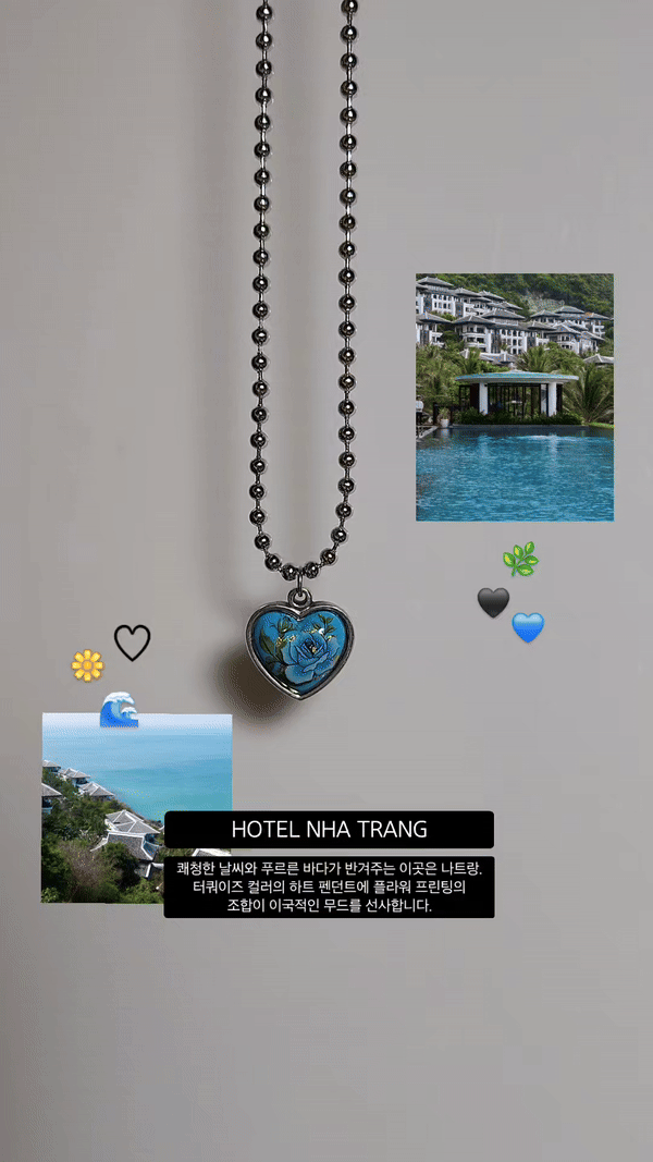 쾌청한 날씨와 푸르른 바다가 반겨주는 이곳은 NHA TRANG. 터쿼이즈 컬러의 하트 펜던트에 플라워 프린팅의 조합이 이국적인 무드를 선사합니다. 전체 써지컬 스틸 소재로 더욱 관리가 편합니다.