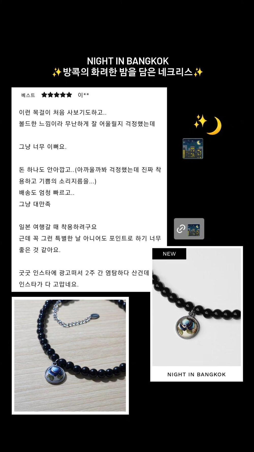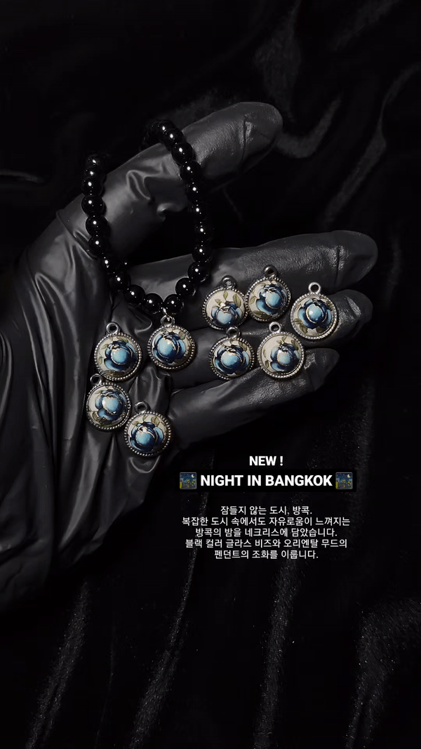 잠들지 않는 도시, 방콕. 복잡한 도시 속에서도 자유로움이 느껴지는 방콕의 밤을 네크리스에 담았습니다. 블랙 컬러 글라스 비즈와 오리엔탈 무드의 펜던트의 조화를 이룹니다. 데일리 코디에 NIGHT IN BANGKOK 네크리스로 시크하고도 깔끔한 스타일링을 완성해보세요.
