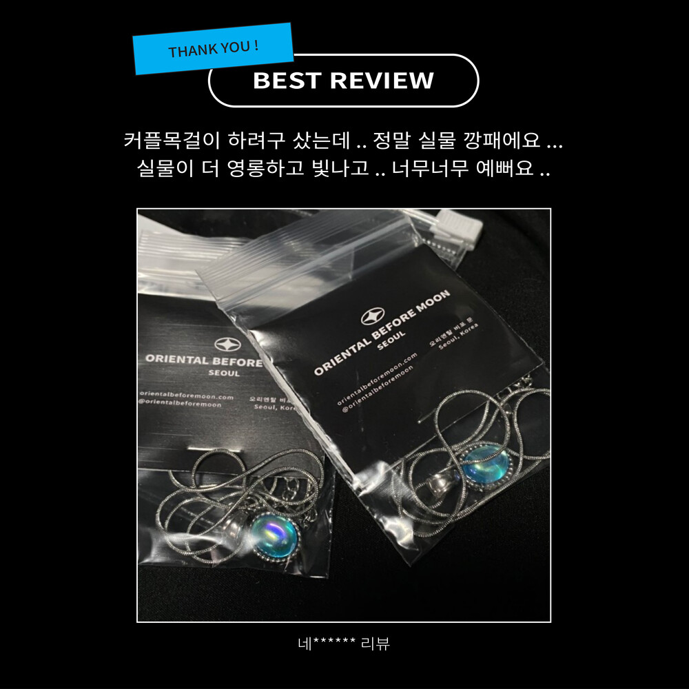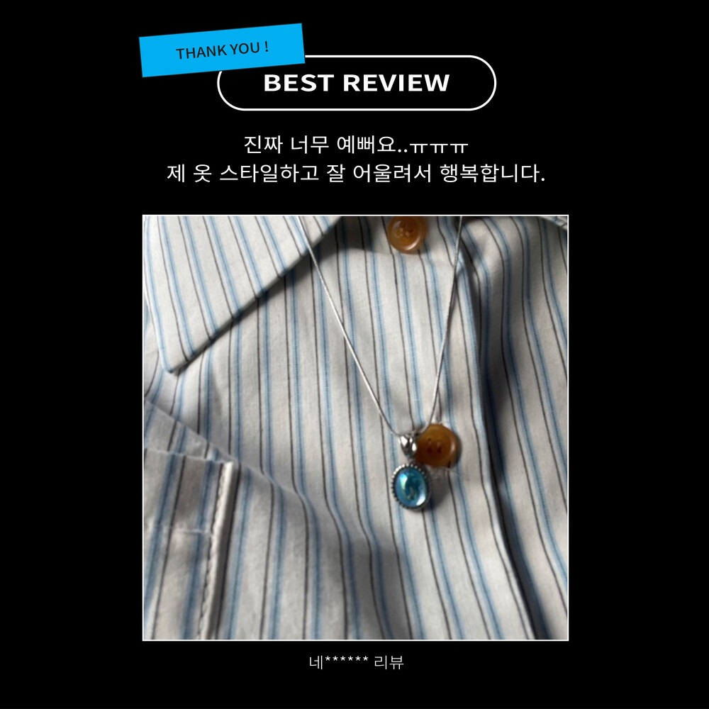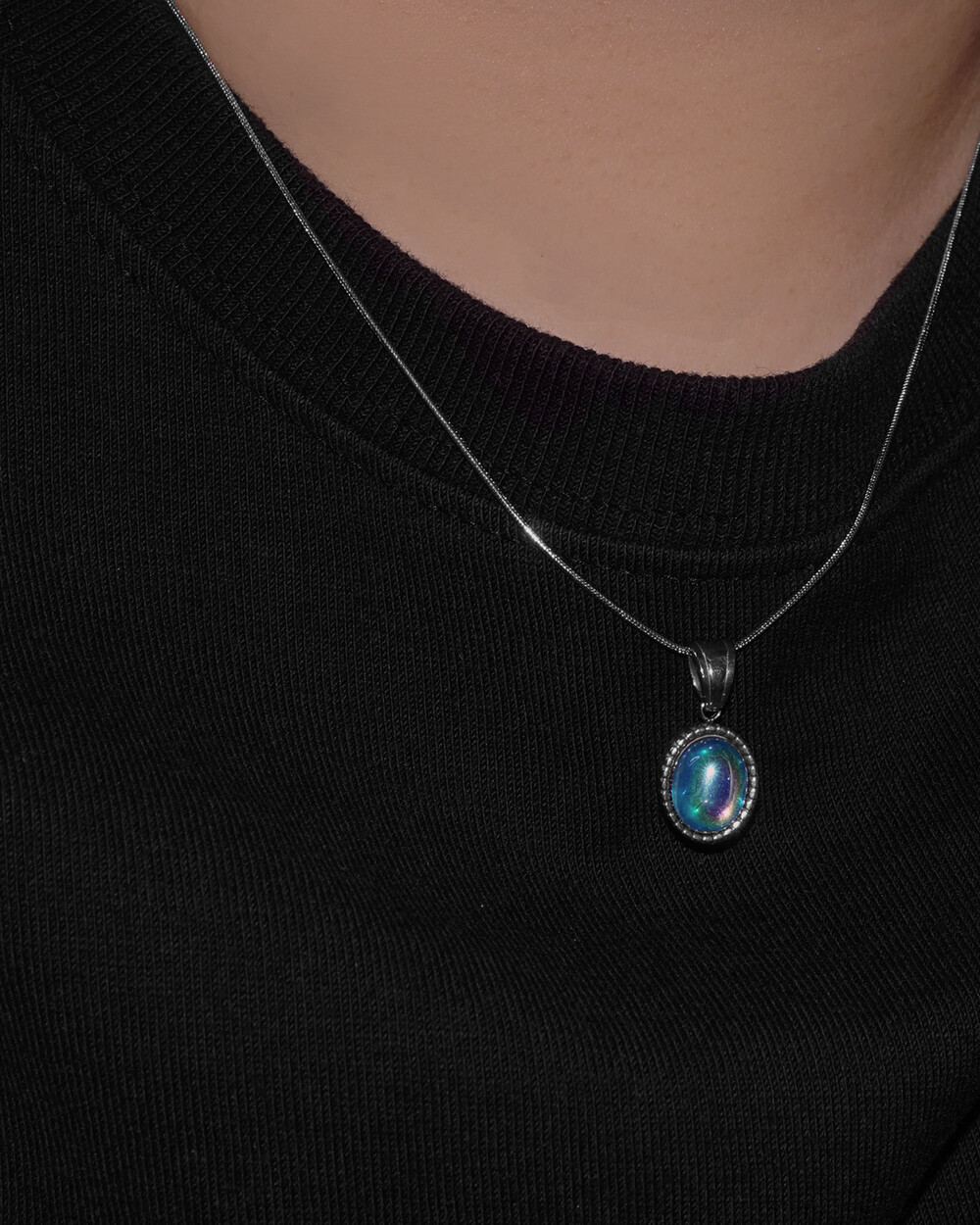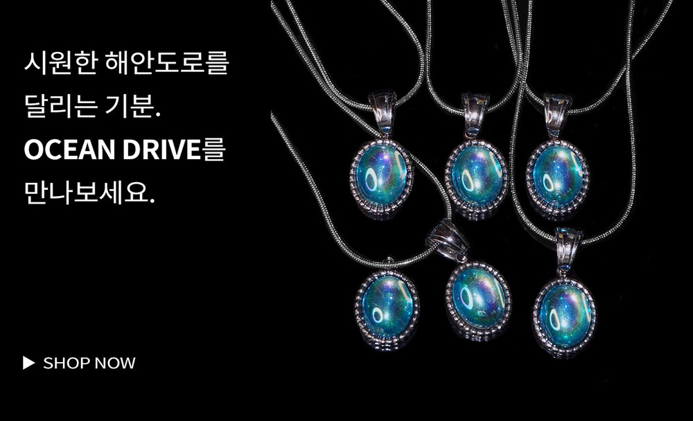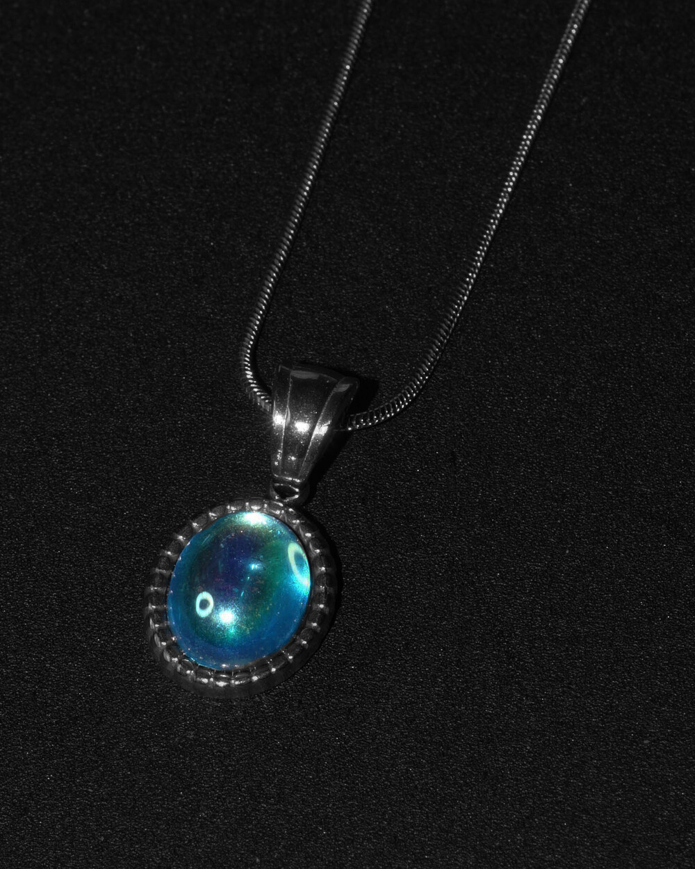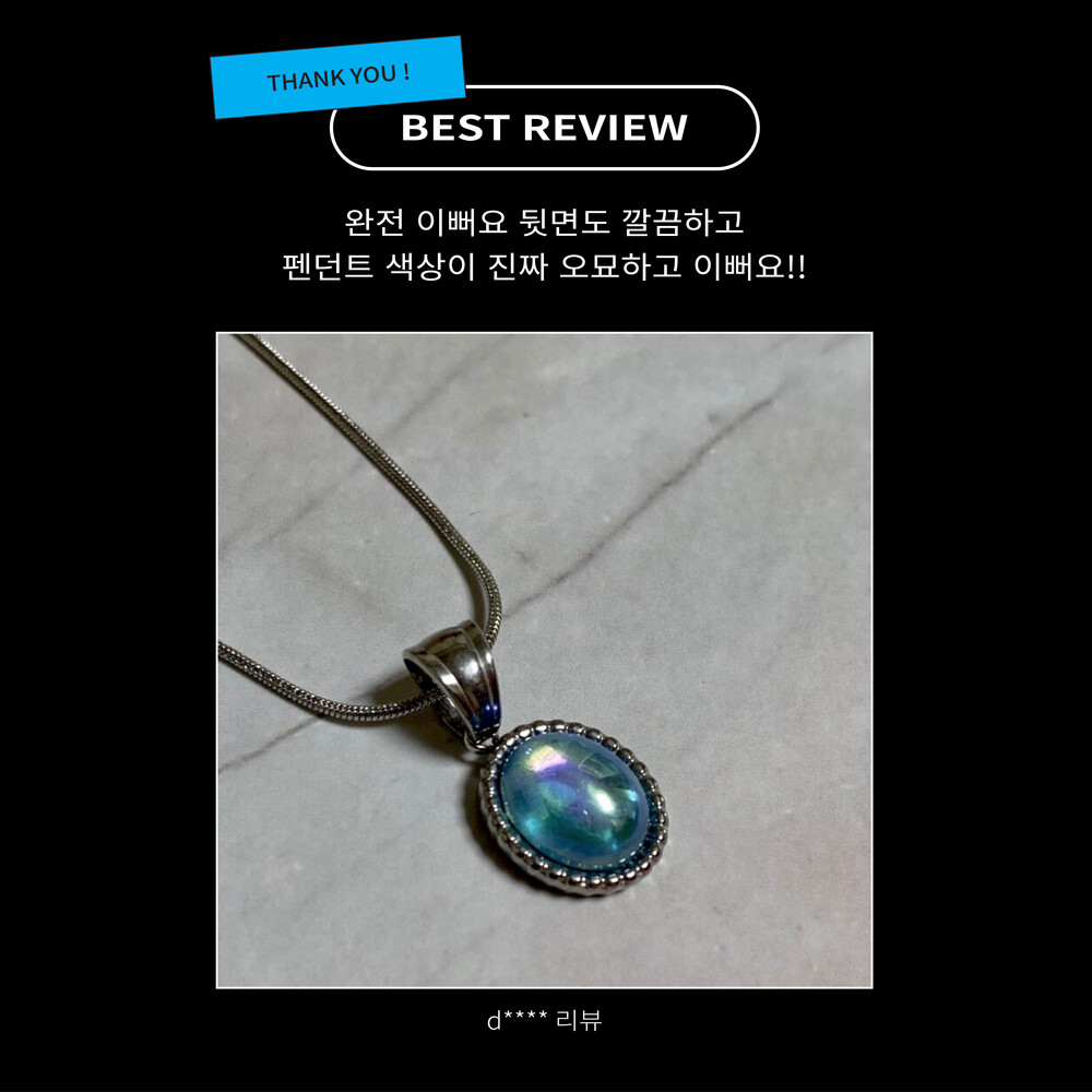 어두운 곳에서도 반짝이는 푸른빛이 영롱한 네크리스. 펜던트 테두리 장식이 빈티지한 무드를 더해주며, 전체 써지컬 소재로 제작되어 알러지/변색 걱정없이 착용하실 수 있습니다.