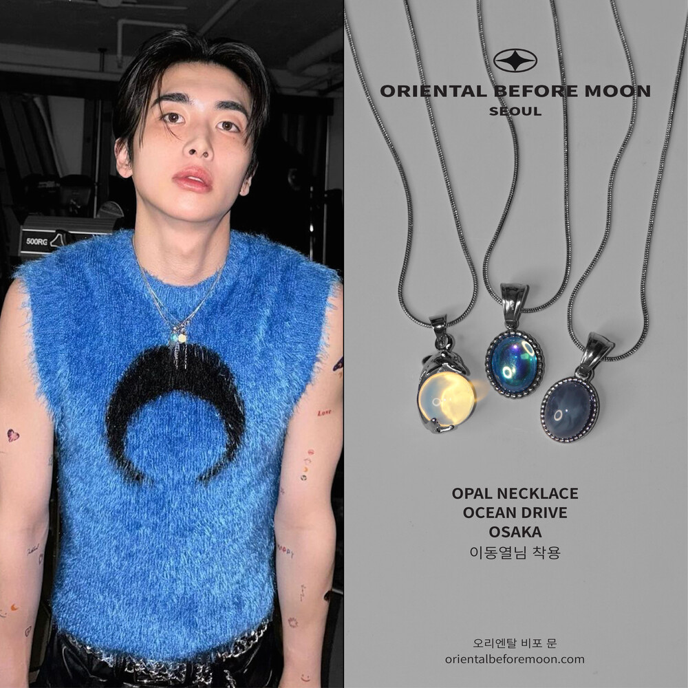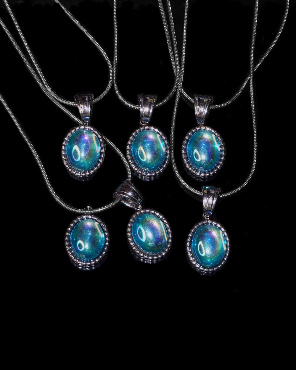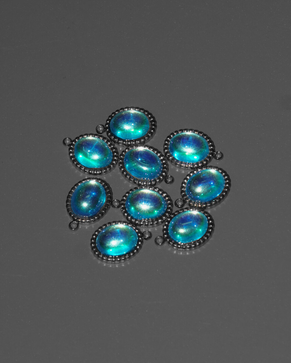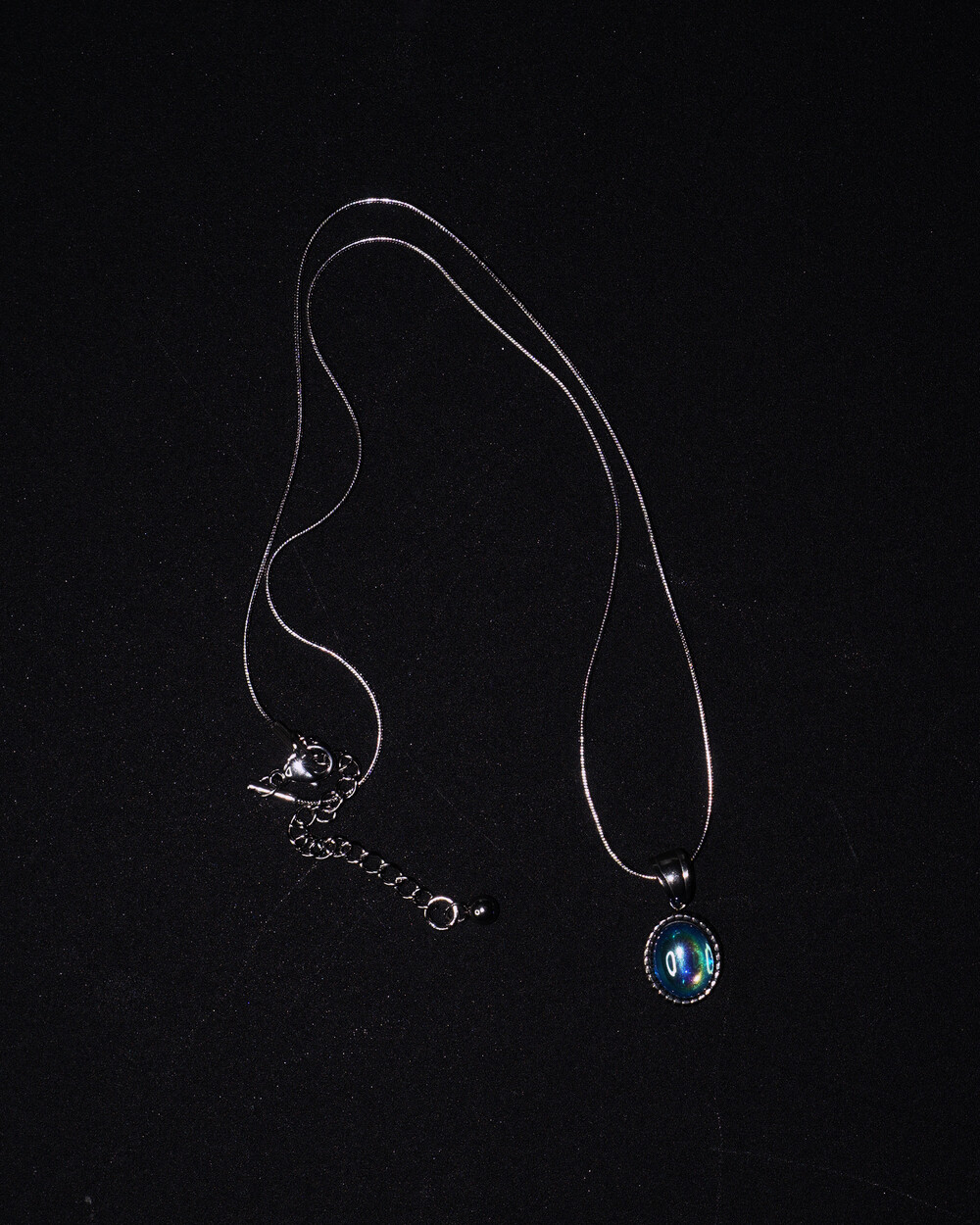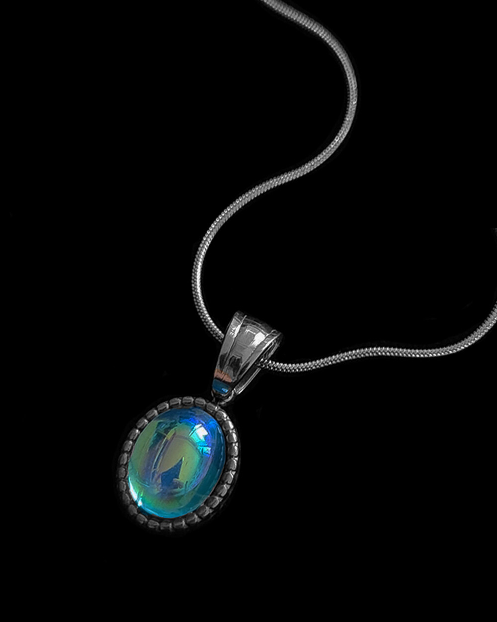 어두운 곳에서도 반짝이는 푸른빛이 영롱한 네크리스. 펜던트 테두리 장식이 빈티지한 무드를 더해주며, 전체 써지컬 소재로 제작되어 알러지/변색 걱정없이 착용하실 수 있습니다.
