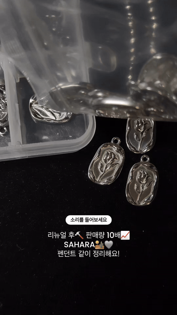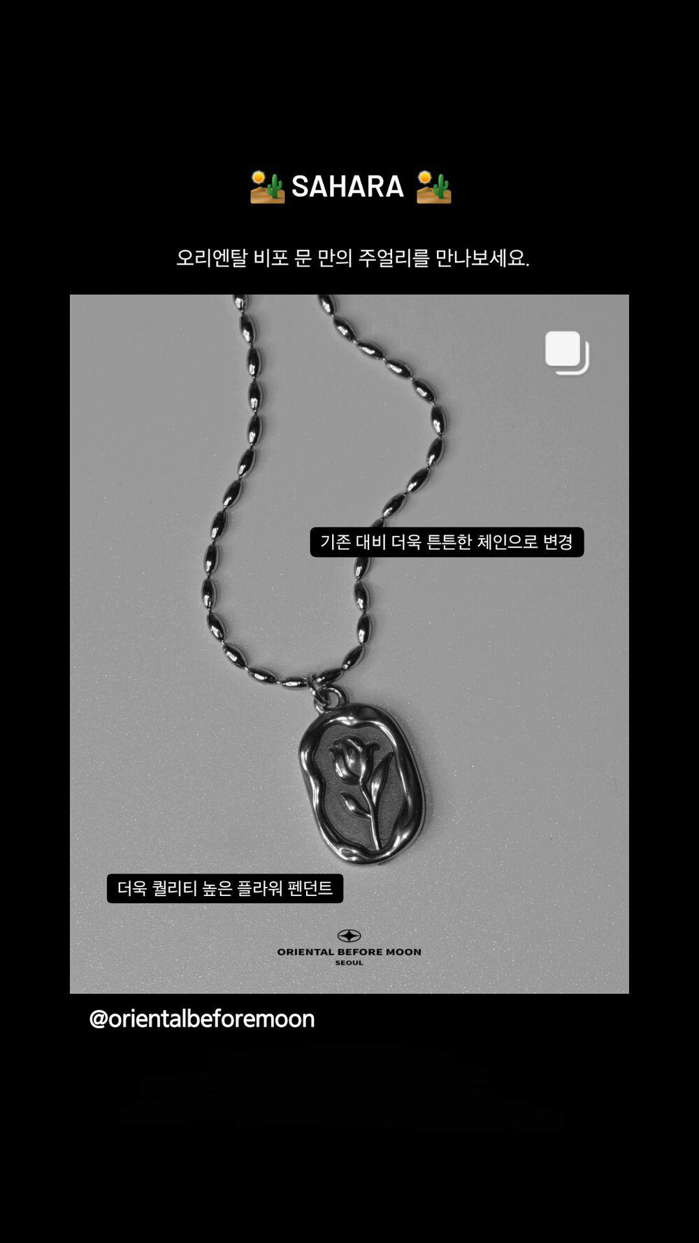 어두운 밤 평화로운 정적이 흐르는 Sahara Desert 에서 발견한 반짝이는 빛. 펜던트와 반짝이는 체인이 멋진 조합을 자랑합니다. All Surgical Steel 소재로 변함없는 빛을 선사합니다. 화려하면서도 데일리한 무드로 어느 코디에든 잘 어울립니다.