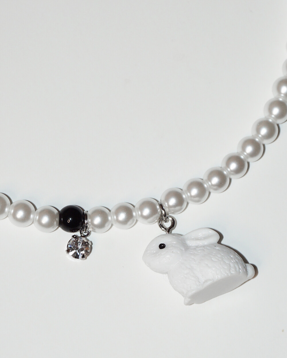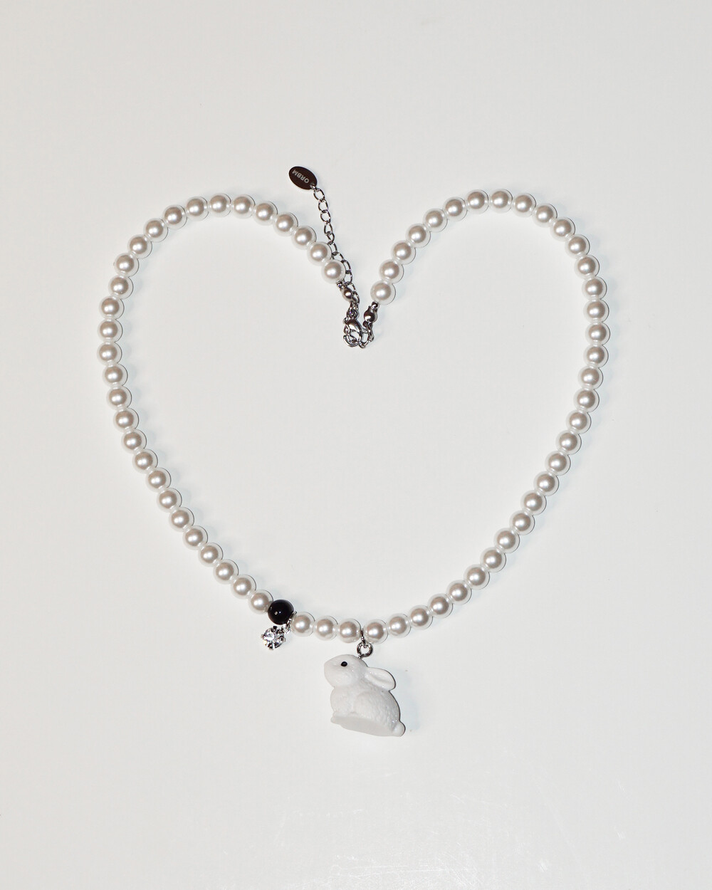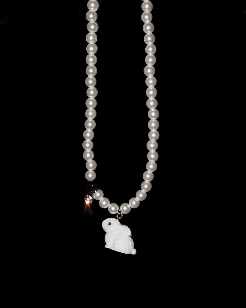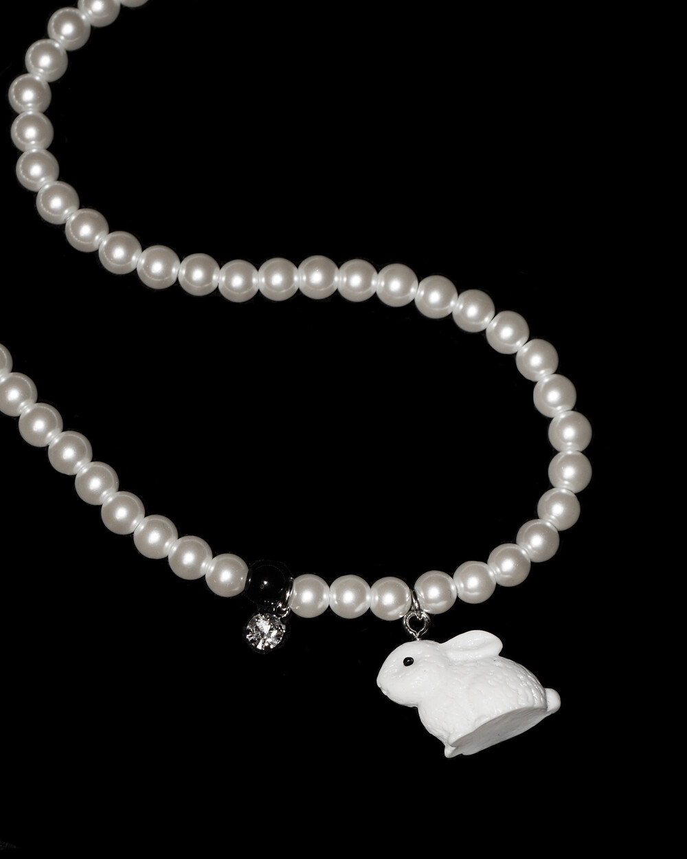 하얗고 통통한 토끼가 글라스 진주와 빛나는 큐빅을 만나 더욱 사랑스럽고 키치한 무드를 자아내는 네크리스.