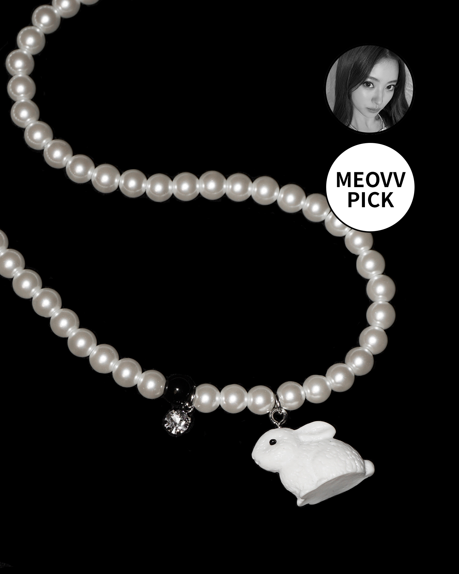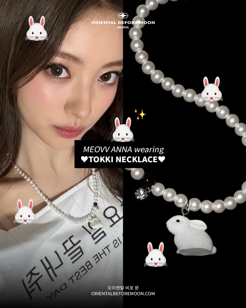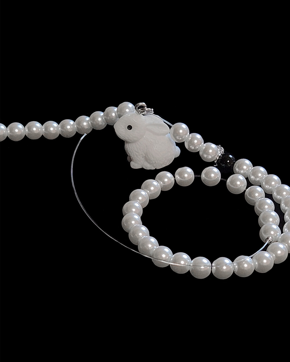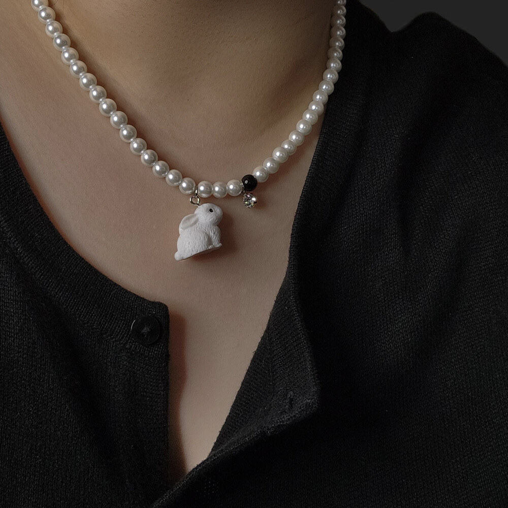 하얗고 통통한 토끼가 글라스 진주와 빛나는 큐빅을 만나 더욱 사랑스럽고 키치한 무드를 자아내는 네크리스.